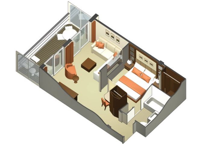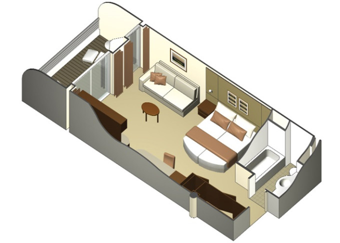 - Kajuty sú umiestnené v blízkosti lodného Spa. K ich vybaveniu patrí posilnený systém vzdušnej filtrácie, posteľ Queen-Size (v kategóriách Edge King-Size), veľké zasúvacie sklenené dvere, exkluzívne posteľné prádlo eXhale®, veľkorysé skladovacie priestory.