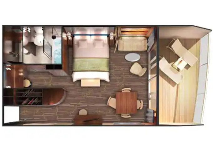 | SF - Forward-facing Penthouse 45-54 m² / balkón 12-25 m². 9,10. paluba - vpredu. Max 3 osoby. Výhody Suite. | 15 748 € 7 874 € za osobu | ||