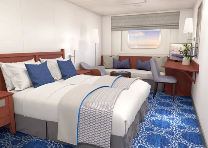 XBO - Kajuta s oknom Cosmos / obmedzený výhľad 14 m². Neotvárateľné okno s obmedzeným výhľadom. 6,7. paluba. Max 4 osoby. 1 718 € 859 € za osobu