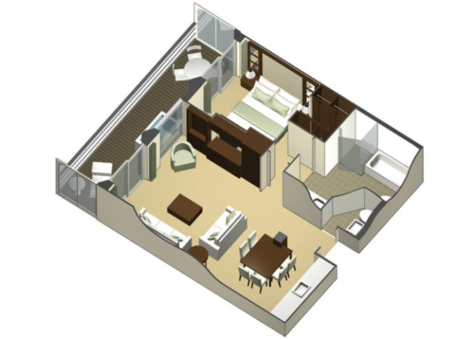 | S1 - Sky Suite 28 m² + balkón 7 m². 6. až 12. paluba. Max 4 osoby. Výhody Suite The Retreat. | 9 900 € 3 300 € za osobu | ||
